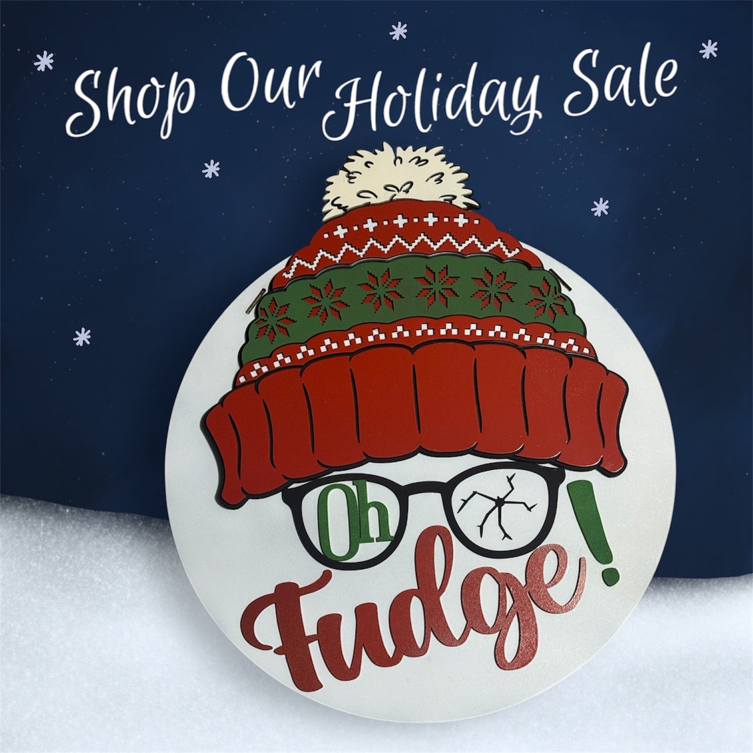 Bring a bit of holiday humor and nostalgia to your front door with this charming 15-inch round door hanger, inspired by the classic A Christmas Story. Featuring the iconic phrase “Oh Fudge” in playful lettering, this door hanger is complete with a whimsical stocking cap and broken eyeglasses, paying homage to one of the movie’s most memorable moments.